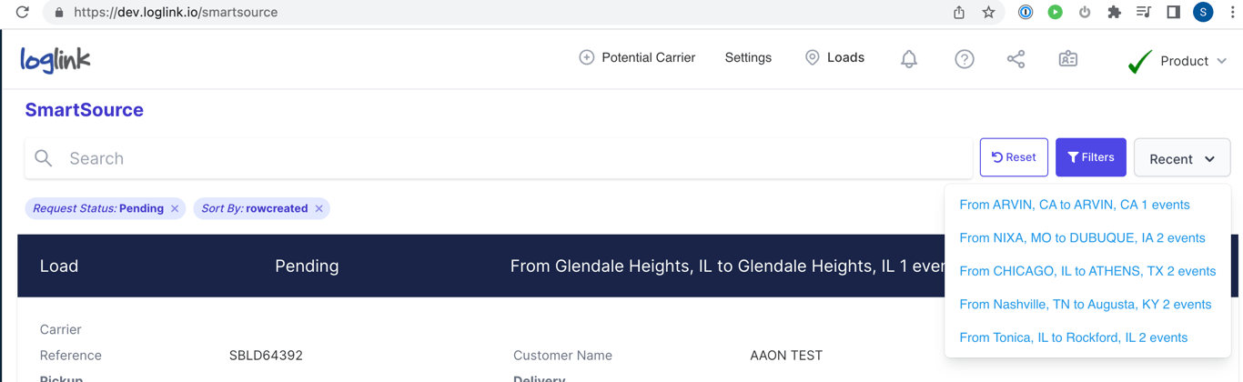 Dropdown near filter option on SmartSource and opsview pages will allow the user to quickly navigate to recent loads. Dropdown shows the most recent 5 loads that the user worked with.