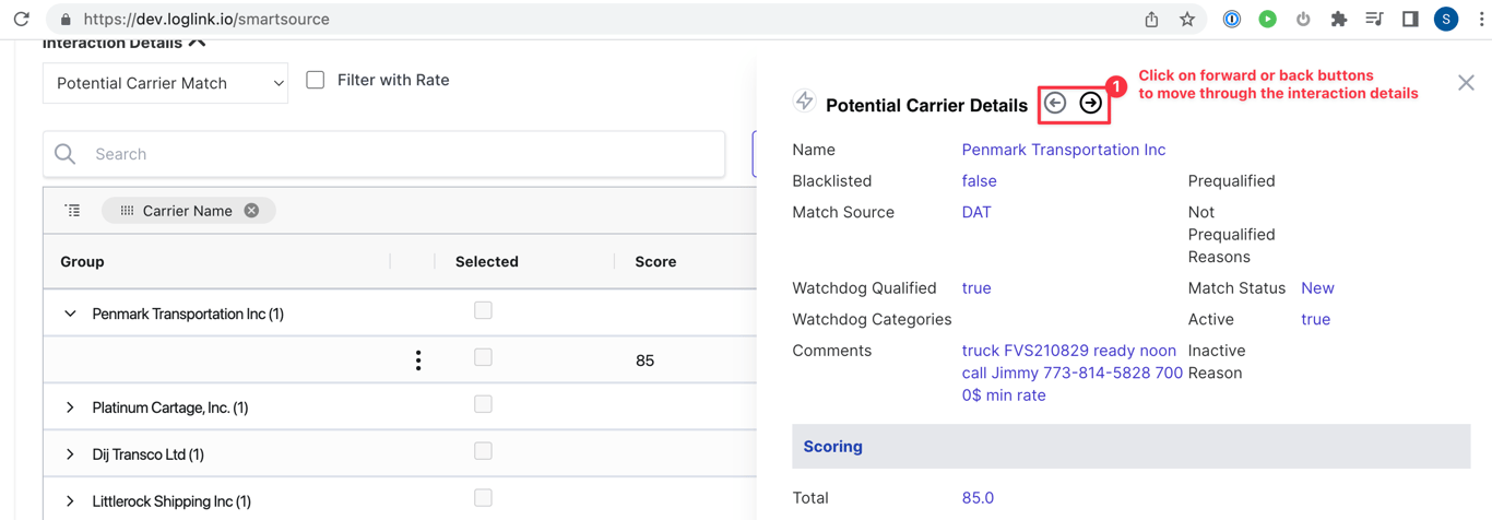 On pages that group requests with their interactions (smartsource and opsview), it is sometimes helpful for the user to be able to move quickly through the details of the interactions. An example might be paging through the list of potential carrier matches on the SmartSource screen in order to see their details while going through the call list.