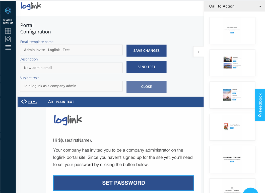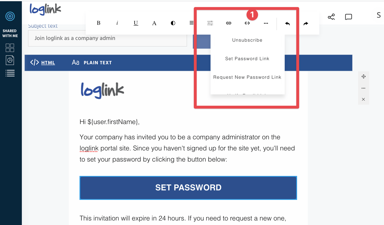 It's really important to ensure that the links such as 'set password' etc are exactly right, as not getting this correct could break login/signup functionality. If you have any questions, please contact us. The standard templates that are provided have the correct links already, but if you make changes be sure to use the links provided from the toolbar top section, labeled "1" in the image below.