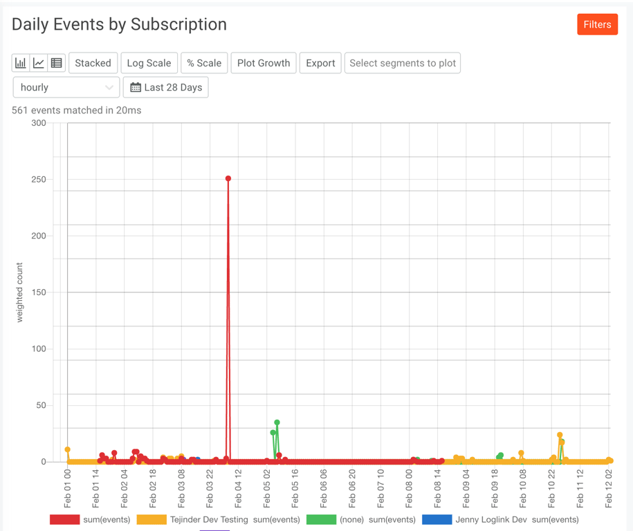 You can also see summary charts of the logs by subscription. For those companies utilizing multiple subscriptions for their own customers under their loglink account, this can give a good view of the relative amount of activity by subscription (i.e. by your customer or by location).