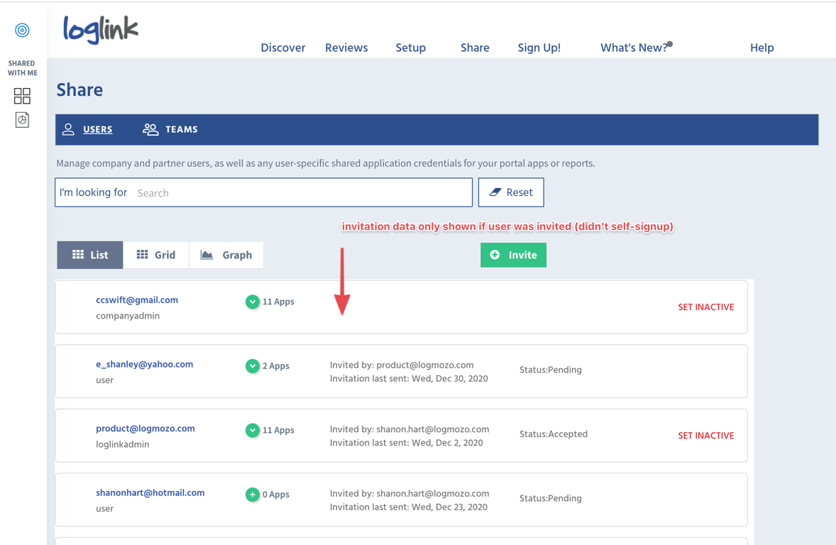 When a user was invited by the signed on user's company, the invitation data for the user will be shown. If the user was invited by a different company, or the user self-signed up, nothing will be shown in this section.